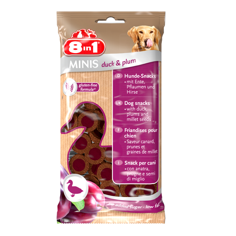 חטיף רך לכלבים המכיל בשר ברווז ושזיפים.